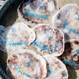 Bohemian wedding dress with satin tulle, COMPLICE – STALO THEODOROU. Checked suit and linen shirt, KOUROSS. Flower design, bouquet and boutonniere, BRILLIANT DECORATION. Wooden chairs, MINT EVENT FINDS. Paper vents, LE BEAU CONCEPTS WEDDING INVITATIONS. Wooden stand, trays, paper pockets for rice, sea shells, glass bottles and white basket, PERGAMOS. Vintage bicycle with ice cream, LOVE ME DO.