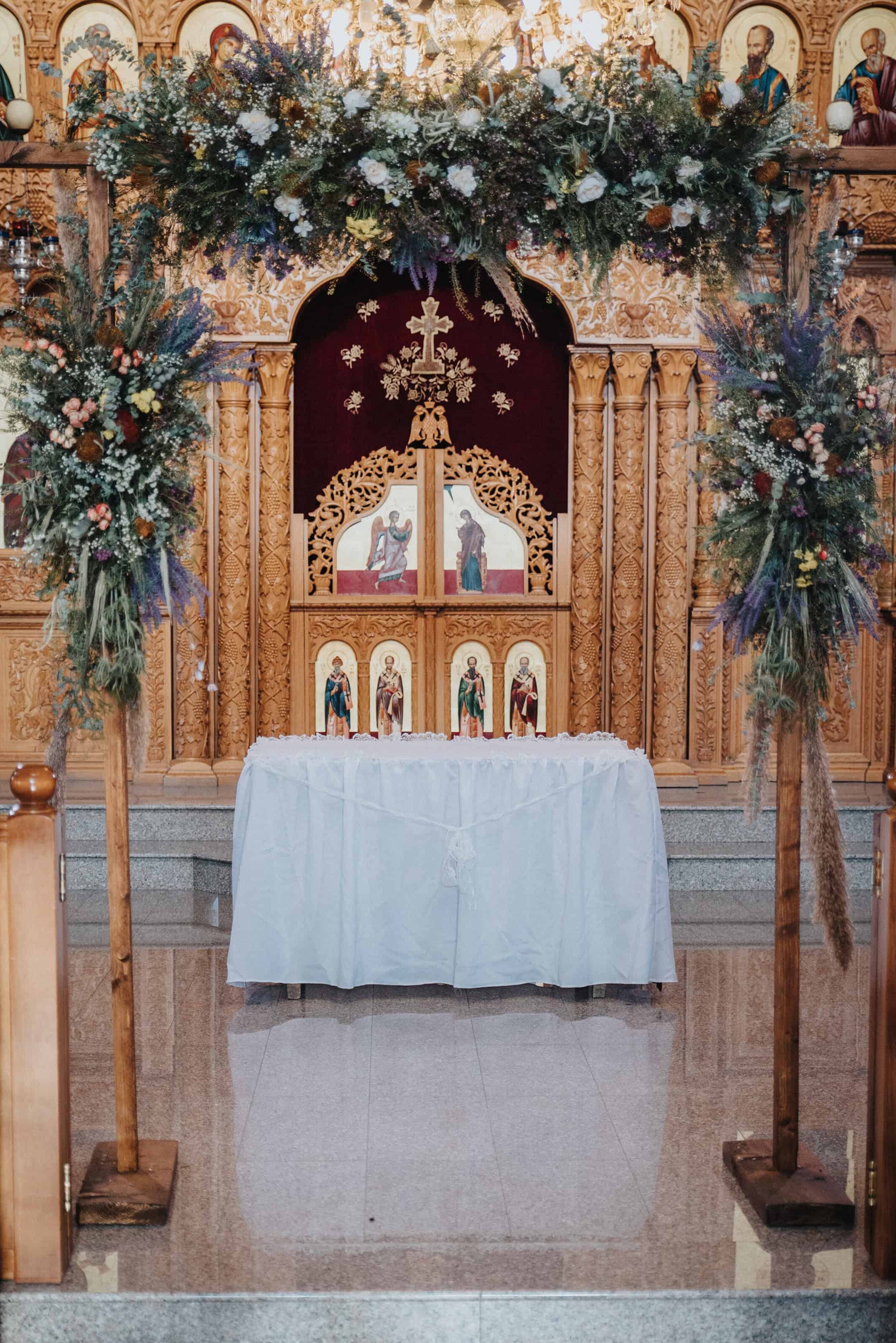 The decoration in the church and dinner was a winner creation of the Design by Sakis team, and just what Gogo had wanted. The colour palette was in pastel tones and, to highlight the wedding theme, dried flowers, baskets, wooden furniture, olive leaves and lemons were used. The interior of the imposing church was decorated with bouquets of dried flowers, while a square, wooden archway with the same flowers “embraced” the couple during the ceremony. The couple’s handmade wedding rings are from Loizos Jewellery and the wreaths, with cross-stitch-like designs, are from Laka Luka.