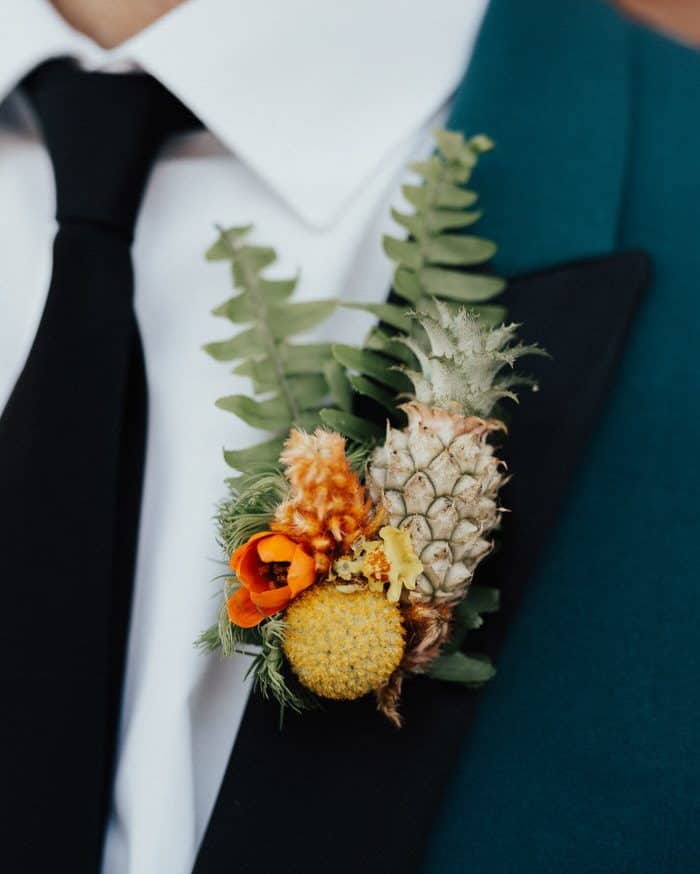Μίνι ανανάδες, αγαπημένα κουμ κουατ αλλά και μούρα εντάσσονται στις συνθέσεις για το πέτο του γαμπρού και δίνουν το απαραίτητο στυλιστικό twist, που κάθε γάμος χρειάζεται. Εννοείται πως αν ο γάμος σας έχει tropical διάθεση, οι μπουτονιέρες με φρούτα είναι σχεδόν μονόδρομος!