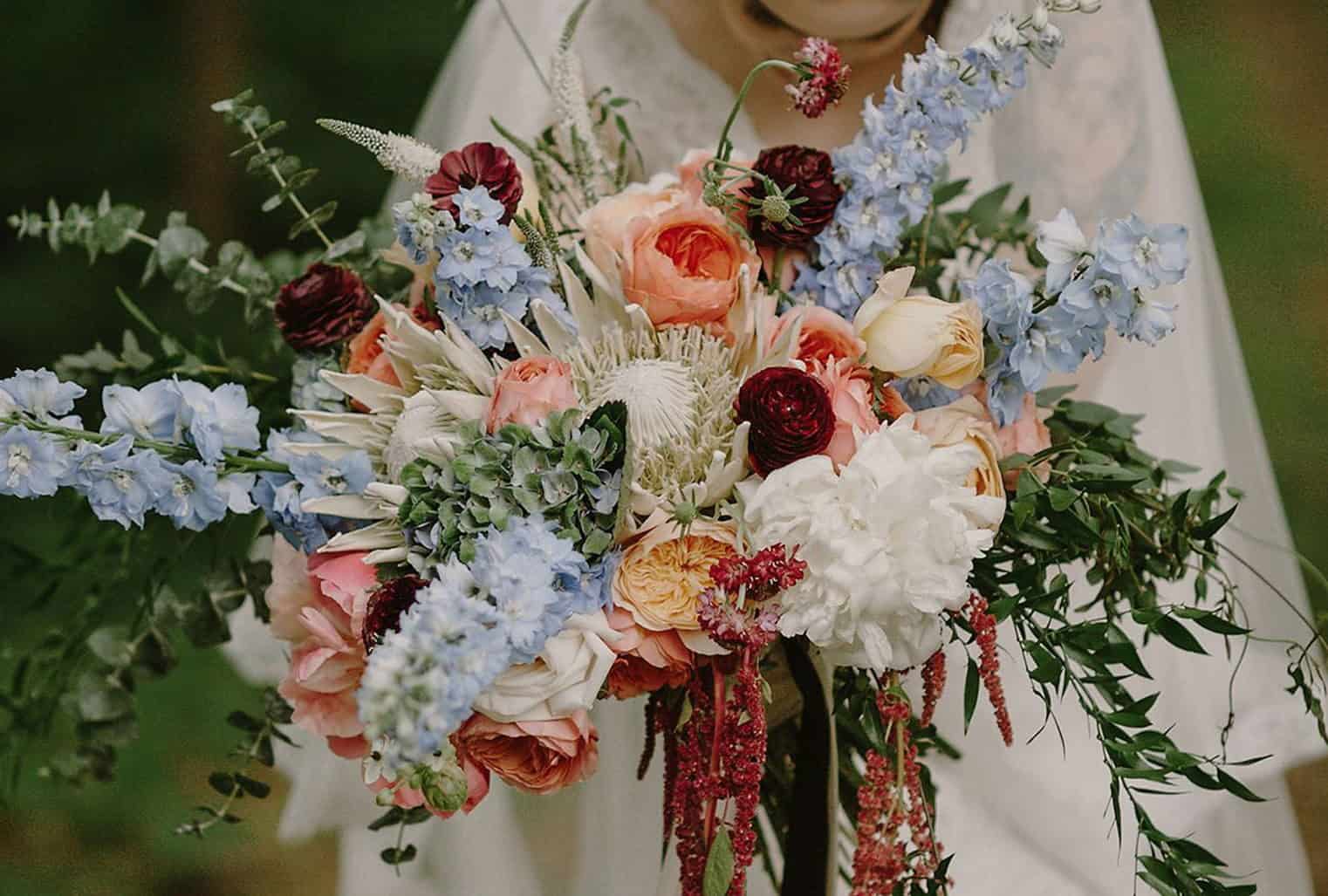 Ανάλογα με το ύφος του γάμου σας μπορείτε να επιλέξετε ανάμεσα σε tropical μπουκέτα με monstera και υάκινθους ή πολύχρωμες συνθέσεις με εξωτικές ορχιδέες σε έντονες αποχρώσεις.