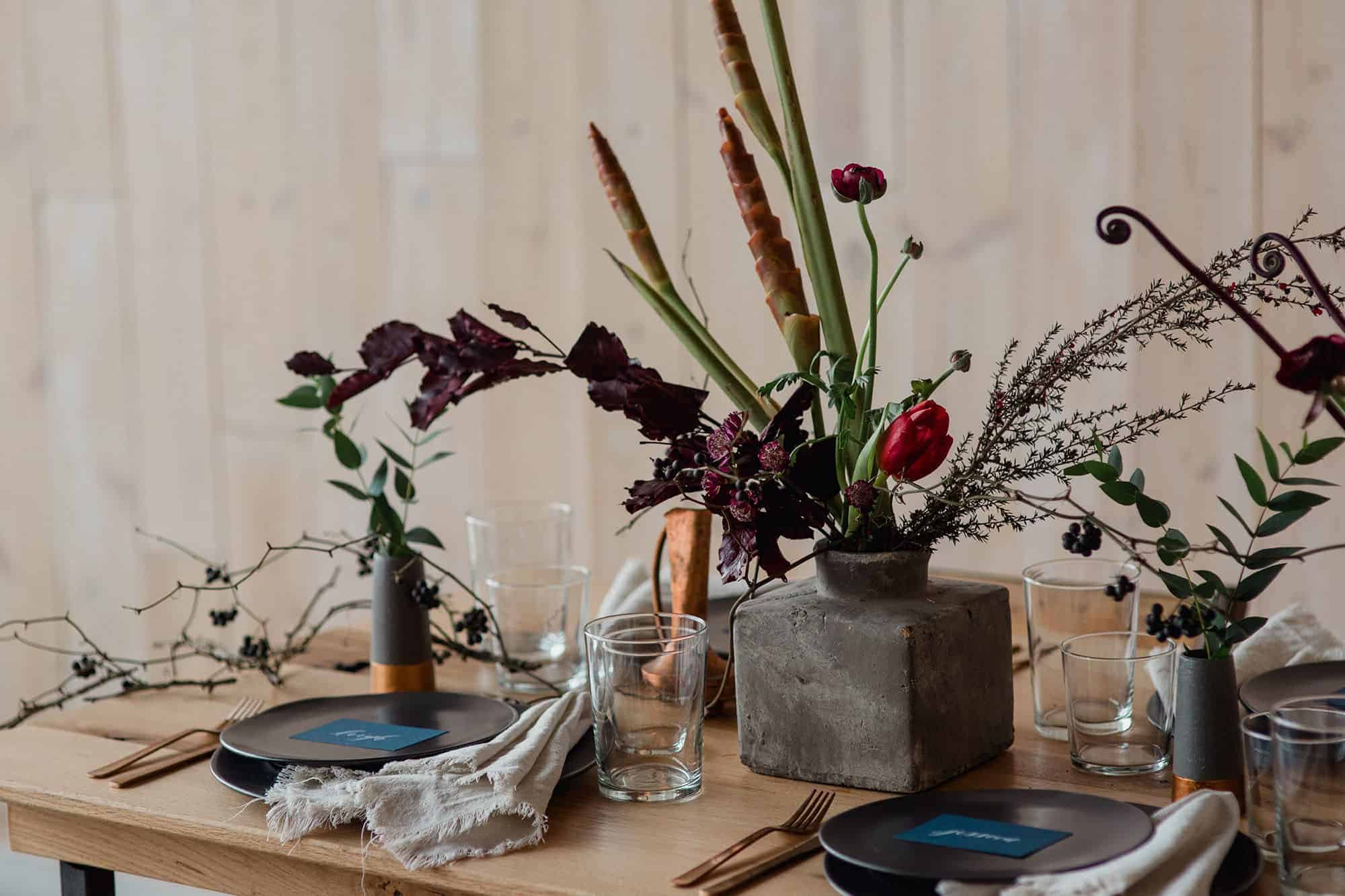 Μαρμάρινες ανθοστήλες σε γκρίζες αποχρώσεις ή βάζα από μπετόν, μπορούν να χρησιμοποιηθούν για τη διακόσμηση των τραπεζιών των καλεσμένων σας. Συνδυάστε τες με εντυπωσιακά έντονα χρώματα και bold λουλούδια ή λιτές συνθέσεις σε παλ αποχρώσεις.