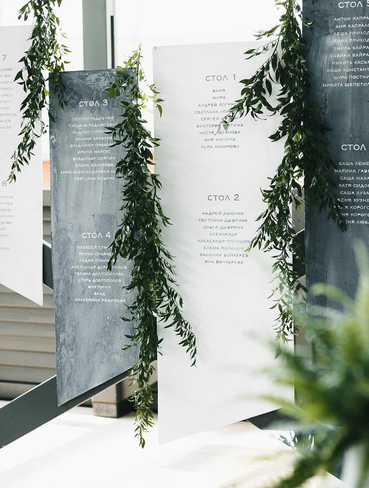 Μικρές πλάκες από διακοσμητικό τσιμέντο σε διάφορες αποχρώσεις με τα ονόματα των καλεσμένων σας μπορούν να χρησιμοποιηθούν για το seating arrangement. Αν πάλι επιθυμείτε κάτι πιο επιβλητικό, τότε τσιμεντένιοι στύλοι που θα αναγράφουν τα τραπέζια διακοσμημένοι με πρασινάδα, είναι μία εντυπωσιακή εναλλακτική.