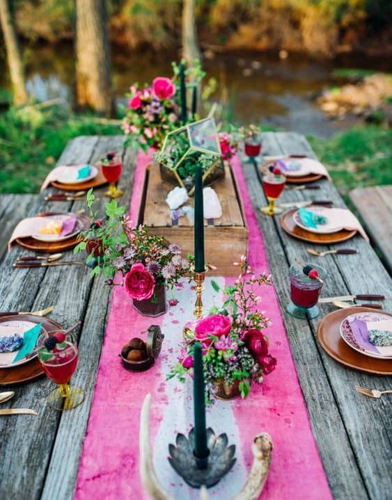 Για το δείπνο μπορείτε να στολίσετε τα ξύλινα τραπέζια, που πιθανόν να υπάρχουν μέσα στο δάσος που έχετε επιλέξει. Αγριολούδα σε χειροποίητα βαζάκια, υφάσματα με μποέμ μοτίβα για ράνερ, ξύλινες κατασκευές, μαύρα λεπτά κεριά, πύλινα πιάτα και μπρονζέ μαχαιροπήρουνα είναι μόνο μερικά από τα στοιχεία που μπορείτε να συμπεριλάβετε στο γαμήλιο τραπέζι για ένα boho chic αποτέλεσμα.