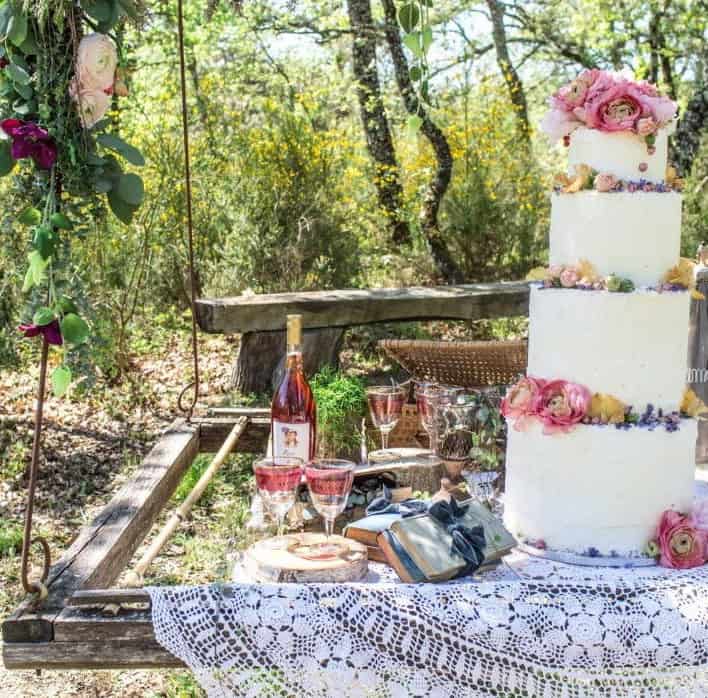 Μια ξύλινη κατασκευή, που θα αιωρείται από ένα δέντρο θα μπορούσε να λειτουργήσει σαν μπουφέ για τη γαμήλια τούρτα, τα γλυκά και το ποτό. Επιλέξτε χειροποίητο τραπεζομάντιλο με βελονάκι και ξύλινους διακοσμητικούς κορμούς για να ολοκληρώσετε την εικόνα.