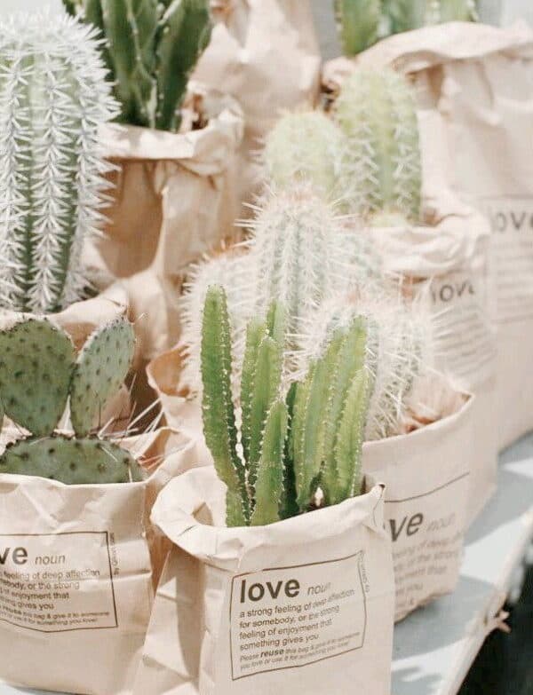 Σε ένα μποέμ γάμο, τί άλλο να χαρίσει κανείς στους καλεσμένους του, παρά κάτι που να είναι συνδεδεμένο με τη φύση. Όπως γλαστράκια με παχύφυτα τοποθετημένα σεοικολογικές σακούλες, οι οποίες θα έχουν τυπωμένο ένα ξεχωριστό μήνυμα.
