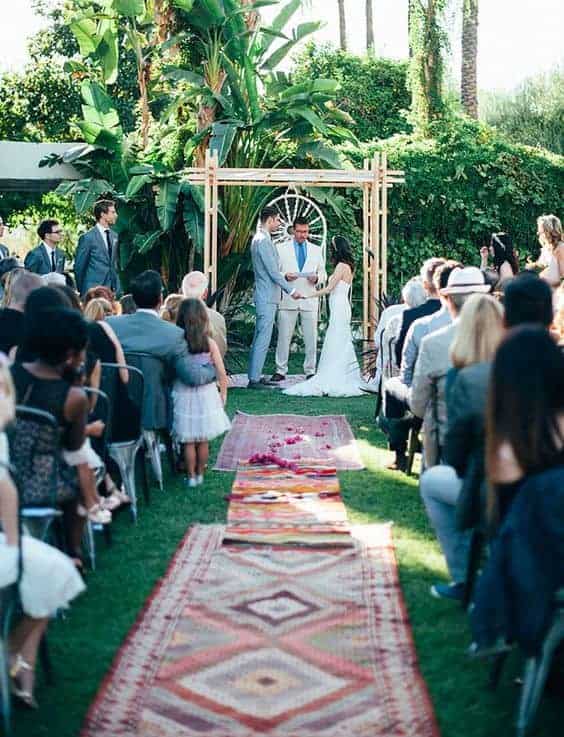 Άλλο ένα στοιχείο που είναι άρρηχτα συνδεδεμένο με το μποέμ στυλ είναι τα εθνίκ χαλιά. Δημιουργήστε λοιπόν ένα διάδρομο από στρωμένα χαλιά που θα καταλήγει σε μια αιωρούμενη σύνθεση λουλουδιών, κάτω από την οποία θα ανταλλάξετε τους όρκους σας.