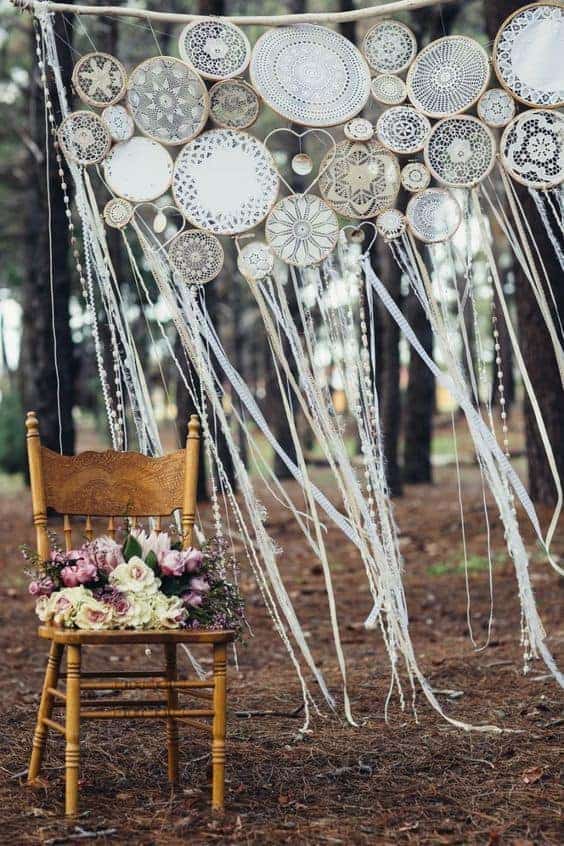 Μιας και οι γάμοι με μποέμ θέμα επιβάλλεται να γίνονται έξω στη φύση, κρεμάστε απ᾽ τα δέντρα λευκές ονειροπαγίδες φτιαγμένες με κεντήματα από βελονάκι.