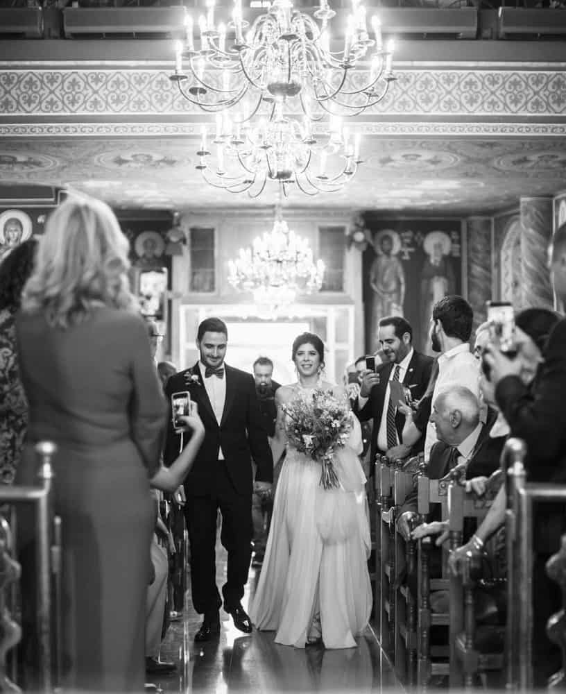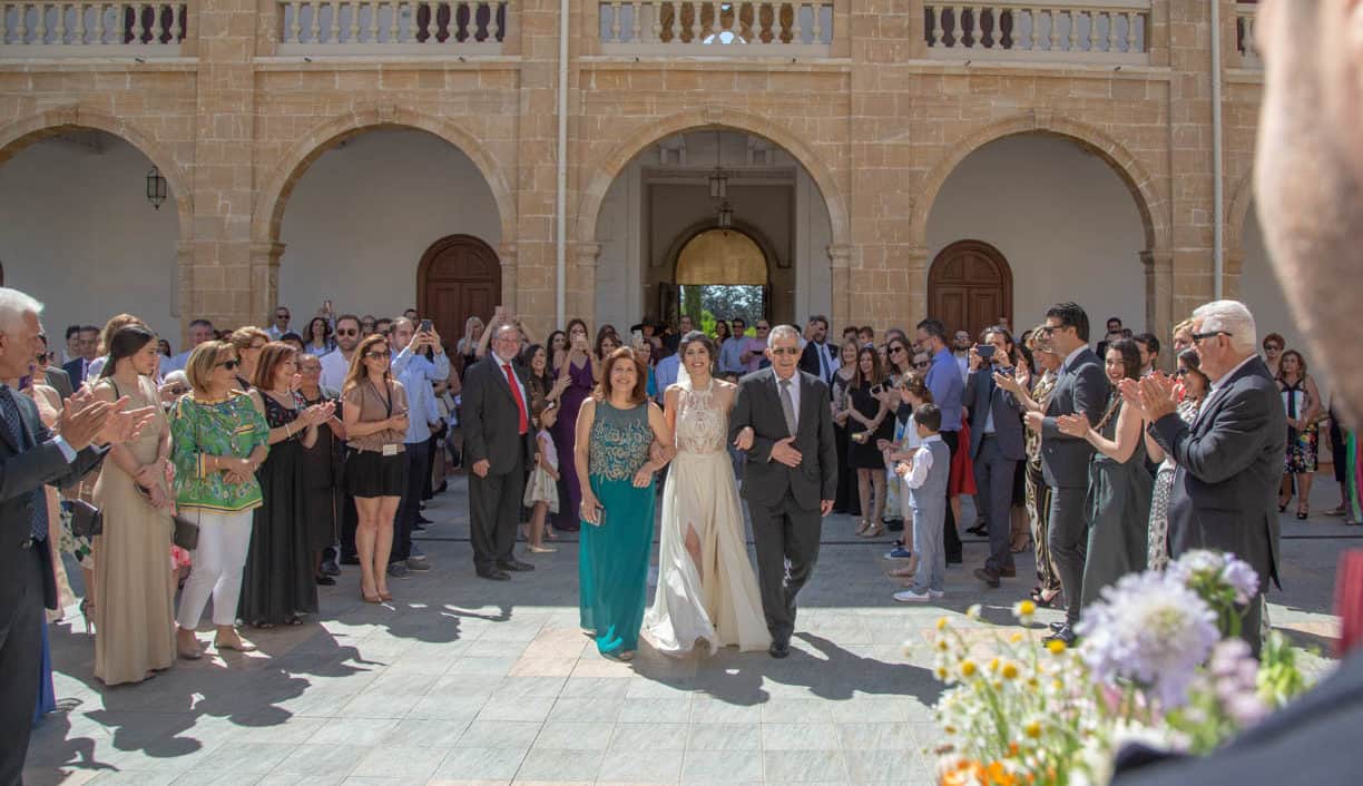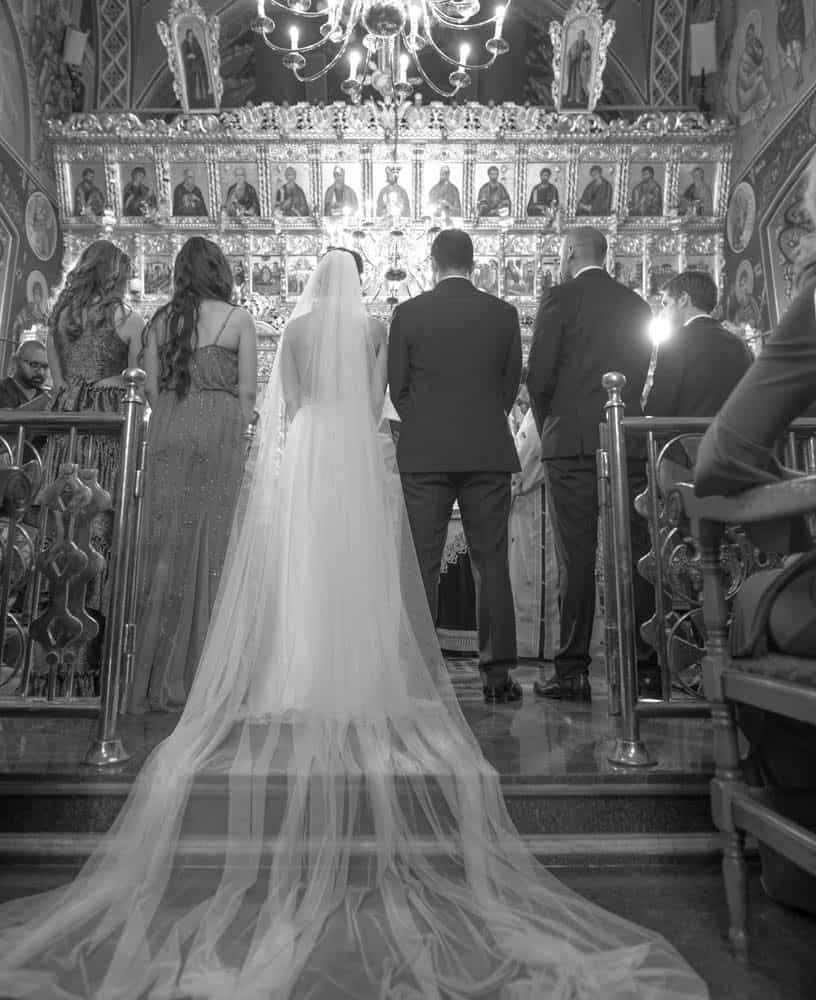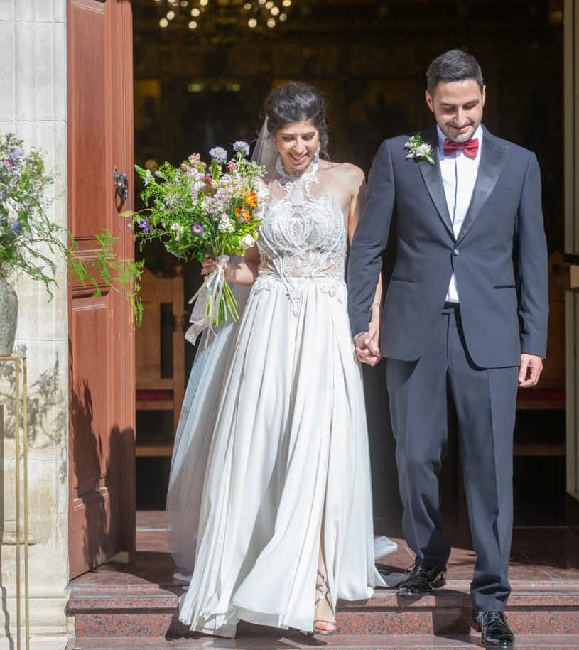 Η πρόταση γάμου έγινε από το Χρίστο, το Μάρτιο του 2018, μετά από πέντε χρόνια σχέσης. Το ζευγάρι επέλεξε για το μυστήριο του γάμου την εκκλησία Αγίου Προκοπίου στο Μετόχι της Ιεράς Μονής Κύκκου. Μετά τη συγκινητική προετοιμασία του ζευγαριού με τους στενούς του φίλους και συγγενείς, ο Χρίστος περίμενε την αγαπημένη του στην είσοδο της εκκλησίας, κρατώντας μια εντυπωσιακή ανθοδέσμη από φρέσκα αγριολούλουδα. Ο κομψός γαμπρός επέλεξε ένα κοστούμι Zegna σε σκούρο μπλε χρώμα, με μαύρα πέτα και μπορντώ παπιγιόν. Σε λίγο, έφτασε στην εκκλησία χαρούμενη και η νύφη, λάμποντας μέσα στο αέρινο νυφικό της, συνοδεύομενη από τους γονείς της.