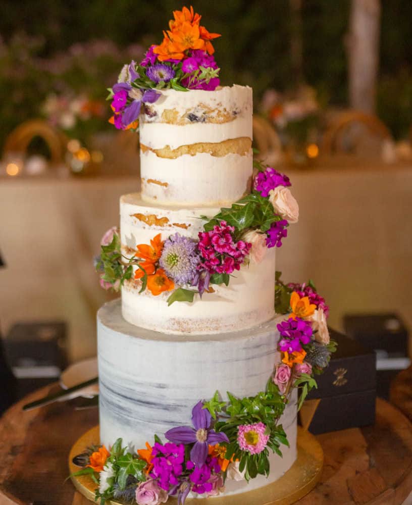 Οι νεόνυμφοι έκοψαν την naked, τριώροφη τούρτα, που ήταν διακοσμημένη με φρέσκα λουλούδια και χόρεψαν τον πρώτο τους χορό.