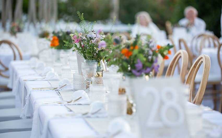 Mετά το μυστήριο, το ζευγάρι υποδέχτηκε τους καλεσμένους του στο Αelia Wellness Retreat. Ένας υπαίθριος χώρος γεμάτος ελαιόδεντρα και βότανα που αποτέλεσε το τέλειο σκηνικό για ένα φυσικό rustic αποτέλεσμα, όπως ακριβώς ήθελε και το ζευγάρι.