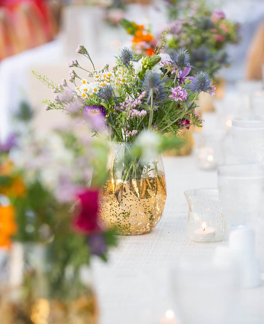 Στη διακόσμηση χησιμοποιήθηκαν φρέσκα αγριολούλουδα, σε απροσδόκητους συνδυασμούς, για να ξεφύγουμε από τα συνηθισμένα στησίματα και συνθέσεις. Συμπεριλάβαμε διαφορετικά ύψη, υφές και χρώματα για να δημιουργήσουμε αυτήν τη χαλαρή, ήρεμη και λιτή εικόνα.
