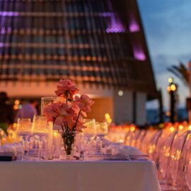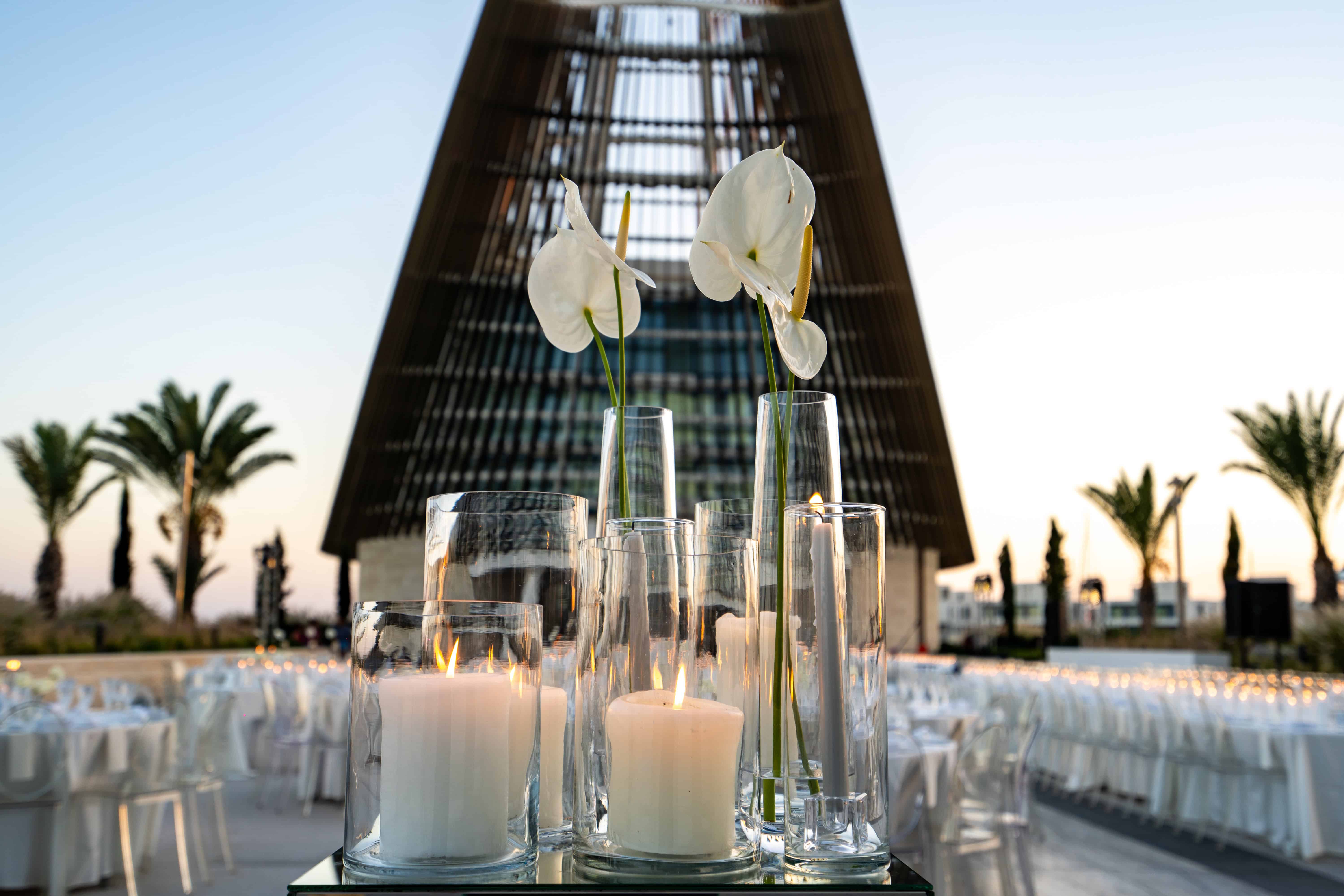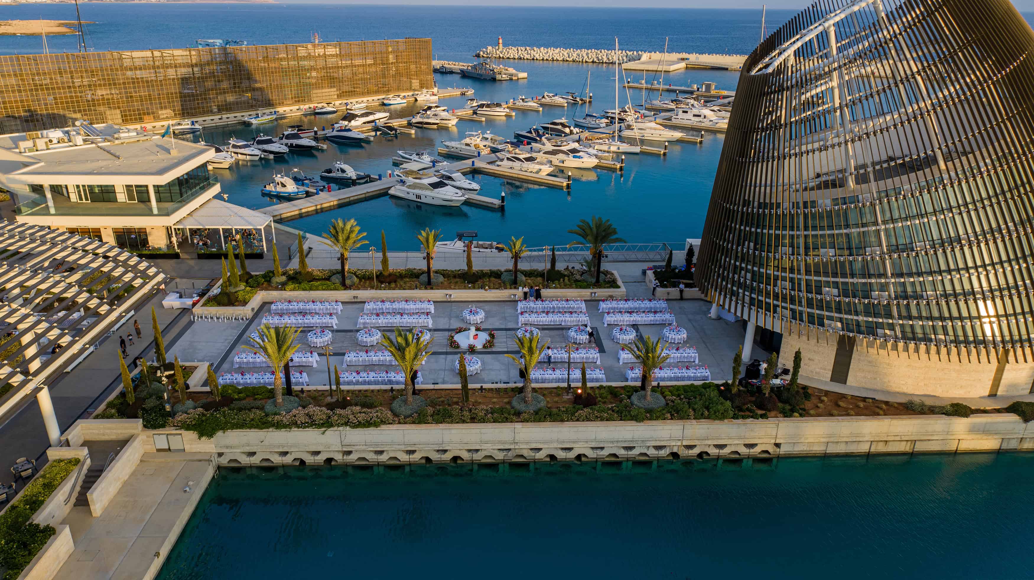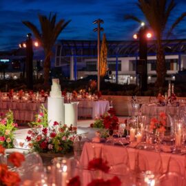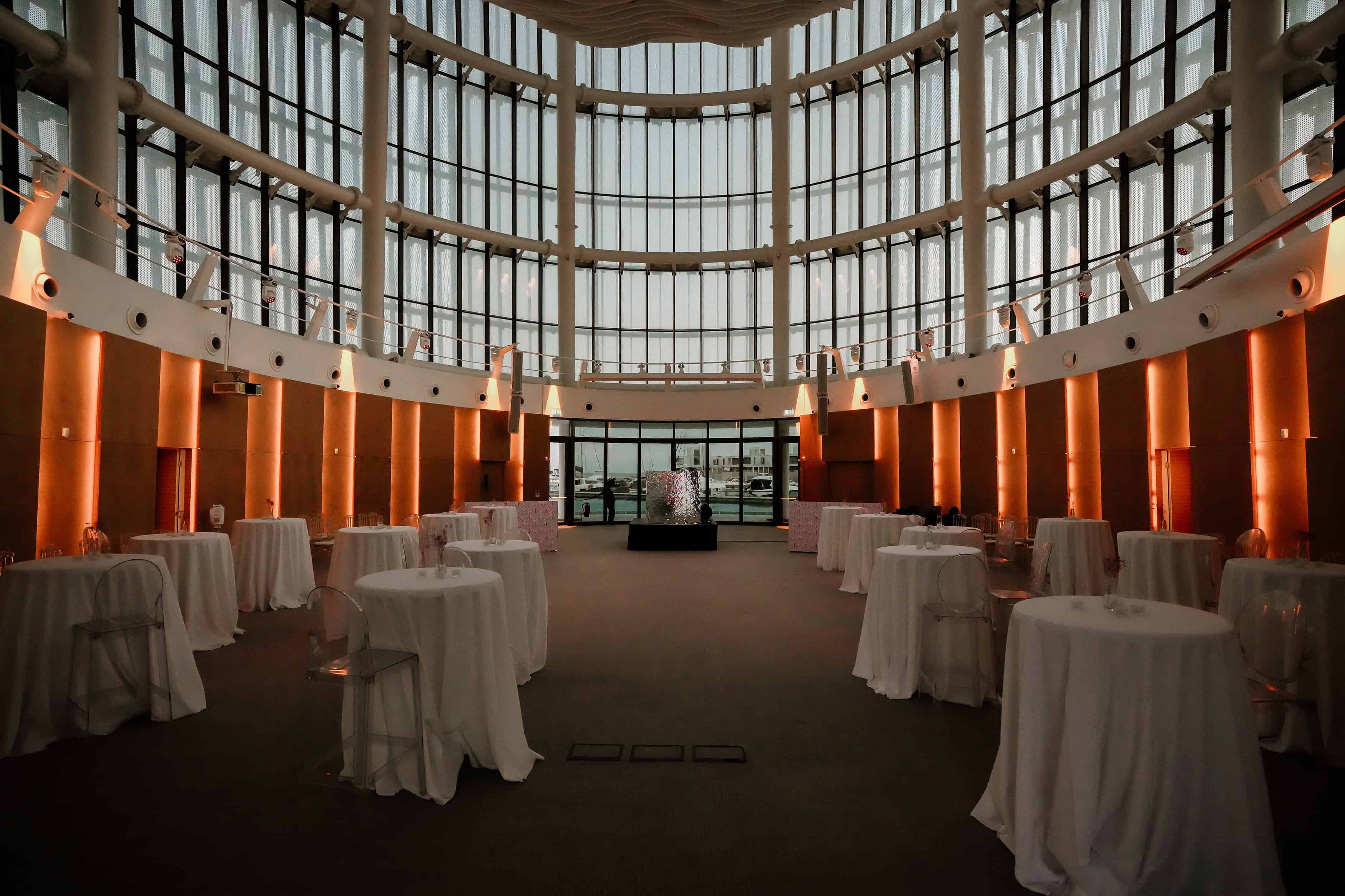 Following the ceremony, an unparalleled culinary experience awaits, where you and your loved ones can celebrate with exceptional cocktails and a delightful reception featuring a buffet or a wedding dinner in a spectacular seaside setting. You can dine and enjoy your drinks either inside the Event Center or outside at the adjacent Event Plaza, under the starlit sky. The architectural charm of the venue adds a touch of luxury to your wedding setting, illuminated and decorated in the colors and materials of your choice.