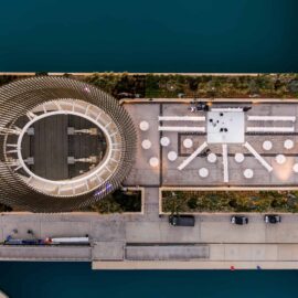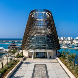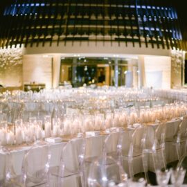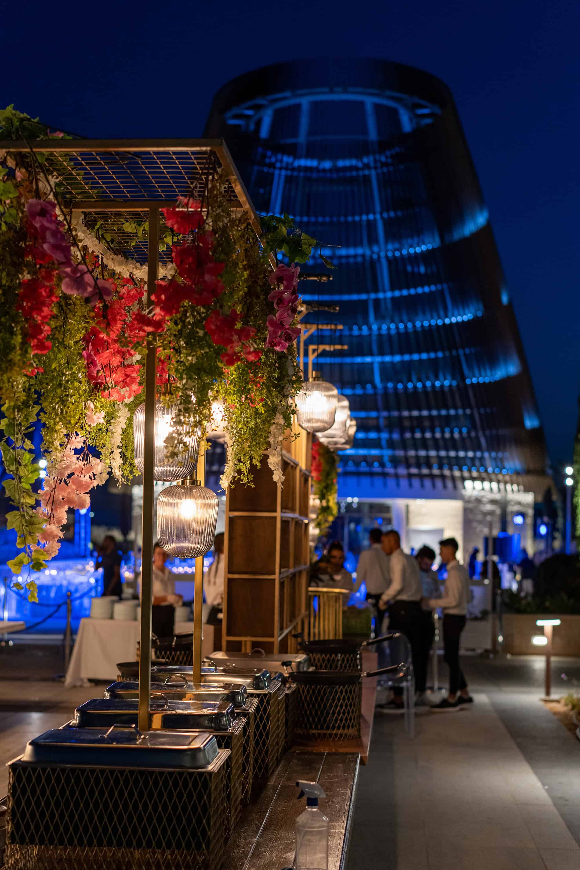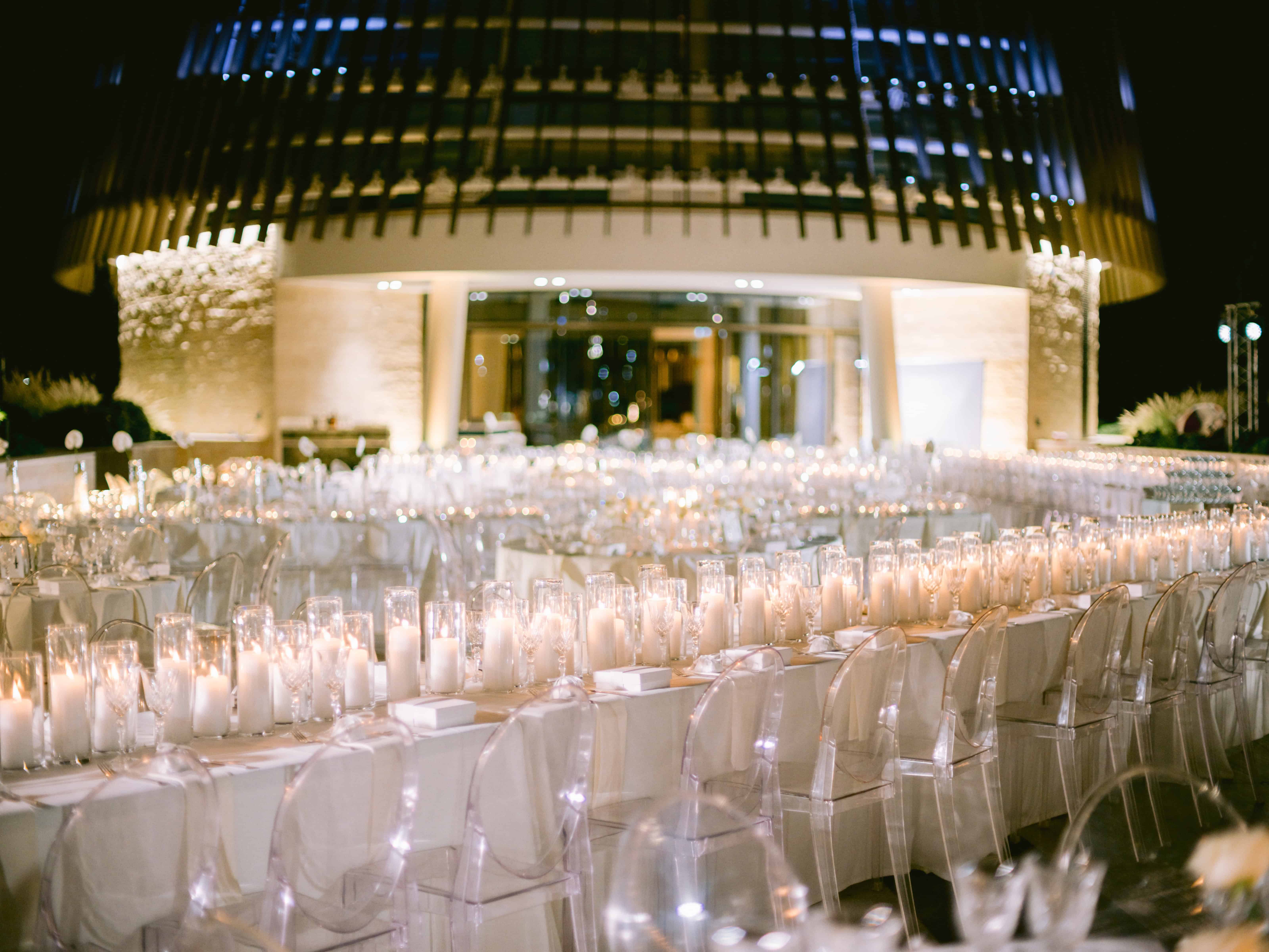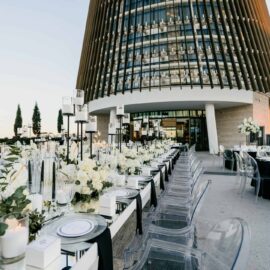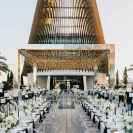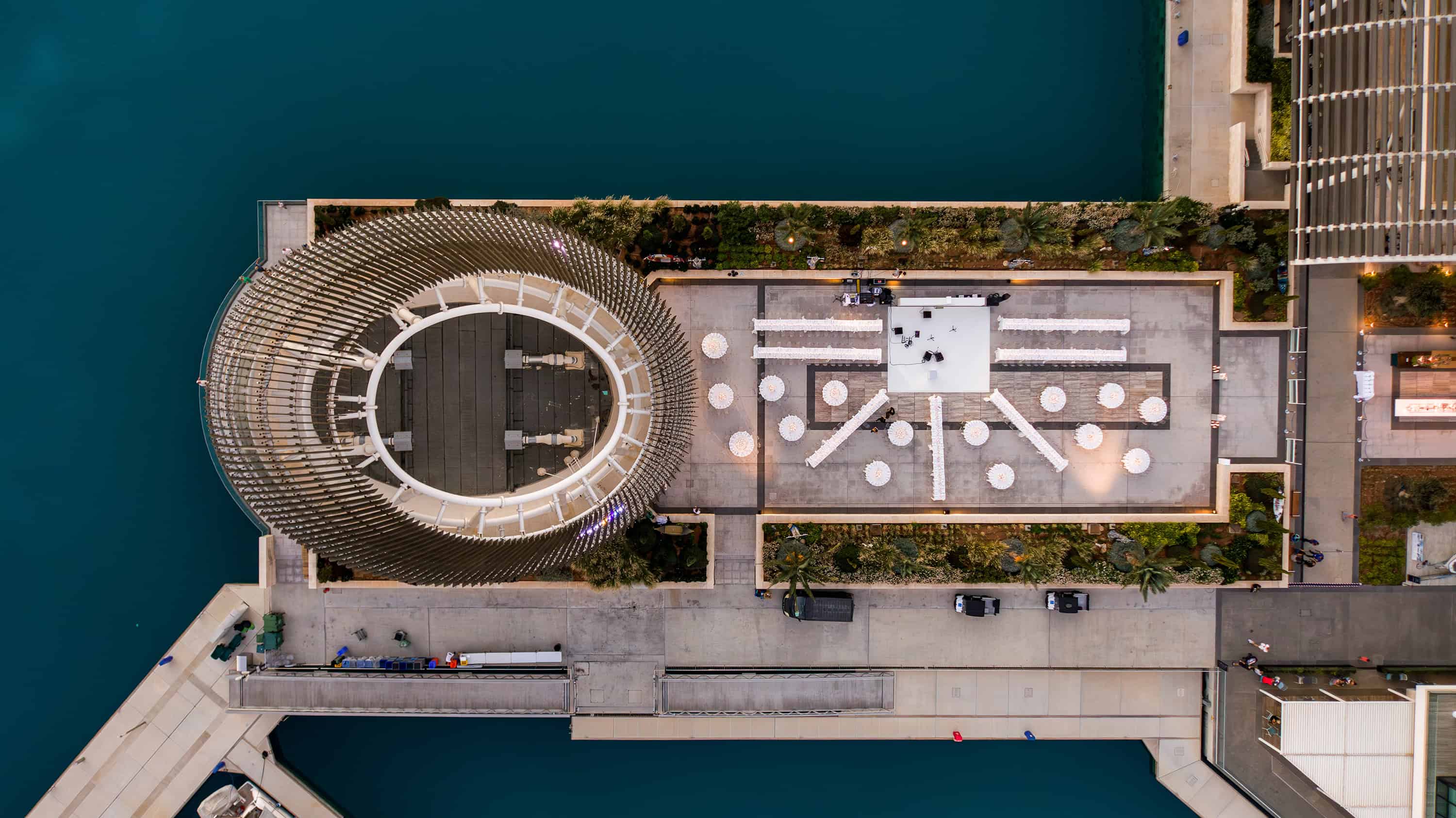Following the ceremony, an unparalleled culinary experience awaits, where you and your loved ones can celebrate with exceptional cocktails and a delightful reception featuring a buffet or a wedding dinner in a spectacular seaside setting. You can dine and enjoy your drinks either inside the Event Center or outside at the adjacent Event Plaza, under the starlit sky. The architectural charm of the venue adds a touch of luxury to your wedding setting, illuminated and decorated in the colors and materials of your choice.