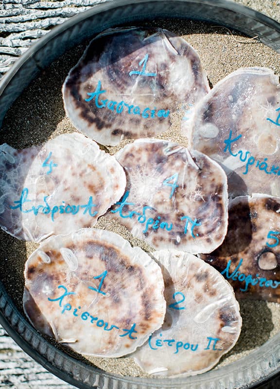 Bohemian wedding dress with satin tulle, COMPLICE – STALO THEODOROU. Checked suit and linen shirt, KOUROSS. Flower design, bouquet and boutonniere, BRILLIANT DECORATION. Wooden chairs, MINT EVENT FINDS. Paper vents, LE BEAU CONCEPTS WEDDING INVITATIONS. Wooden stand, trays, paper pockets for rice, sea shells, glass bottles and white basket, PERGAMOS. Vintage bicycle with ice cream, LOVE ME DO.